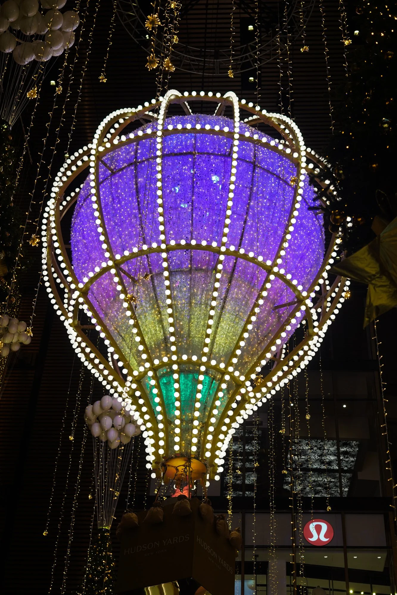 Hudson Yards is glamorous and the right kind of over the top. When you step inside, you’re immediately in the glow of more than two million lights hanging from the ceilings, lining the walkways, and cascading down the grand entrances. The Shops are decked out with beautiful and unique decorations like the hot air balloons you see below.