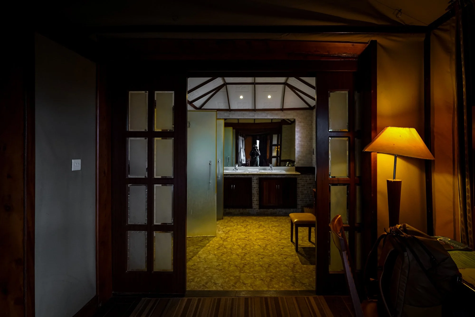 Everything you could need is right inside the tent. The bathroom is full-sized and impressively spacious, with a standing shower, a separate toilet room, double sinks, and a vanity area. There’s also a desk for journaling or working, plus a beautiful wardrobe with a safe inside.