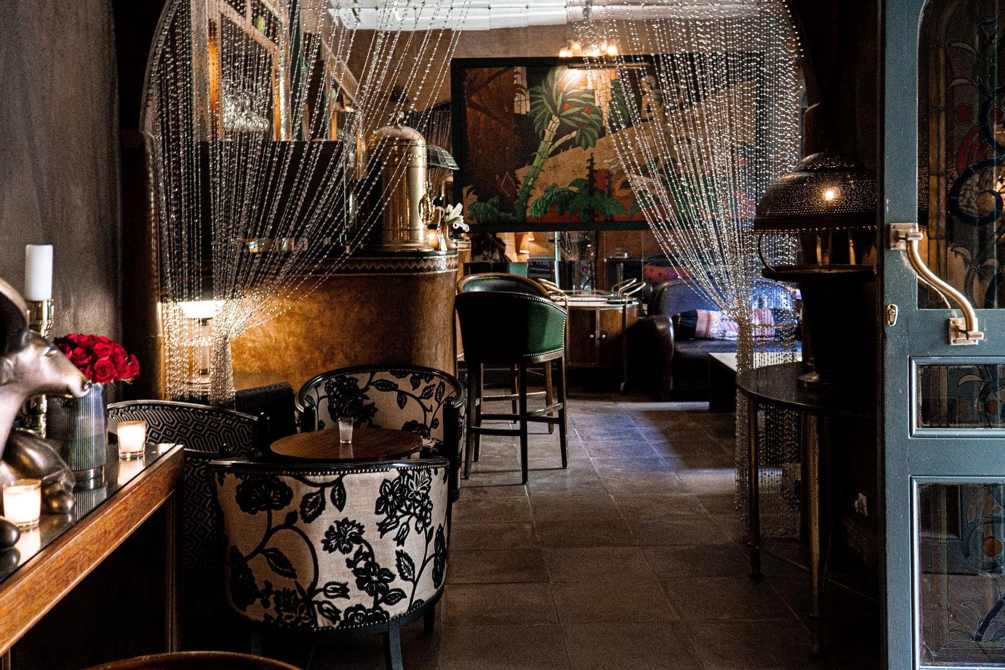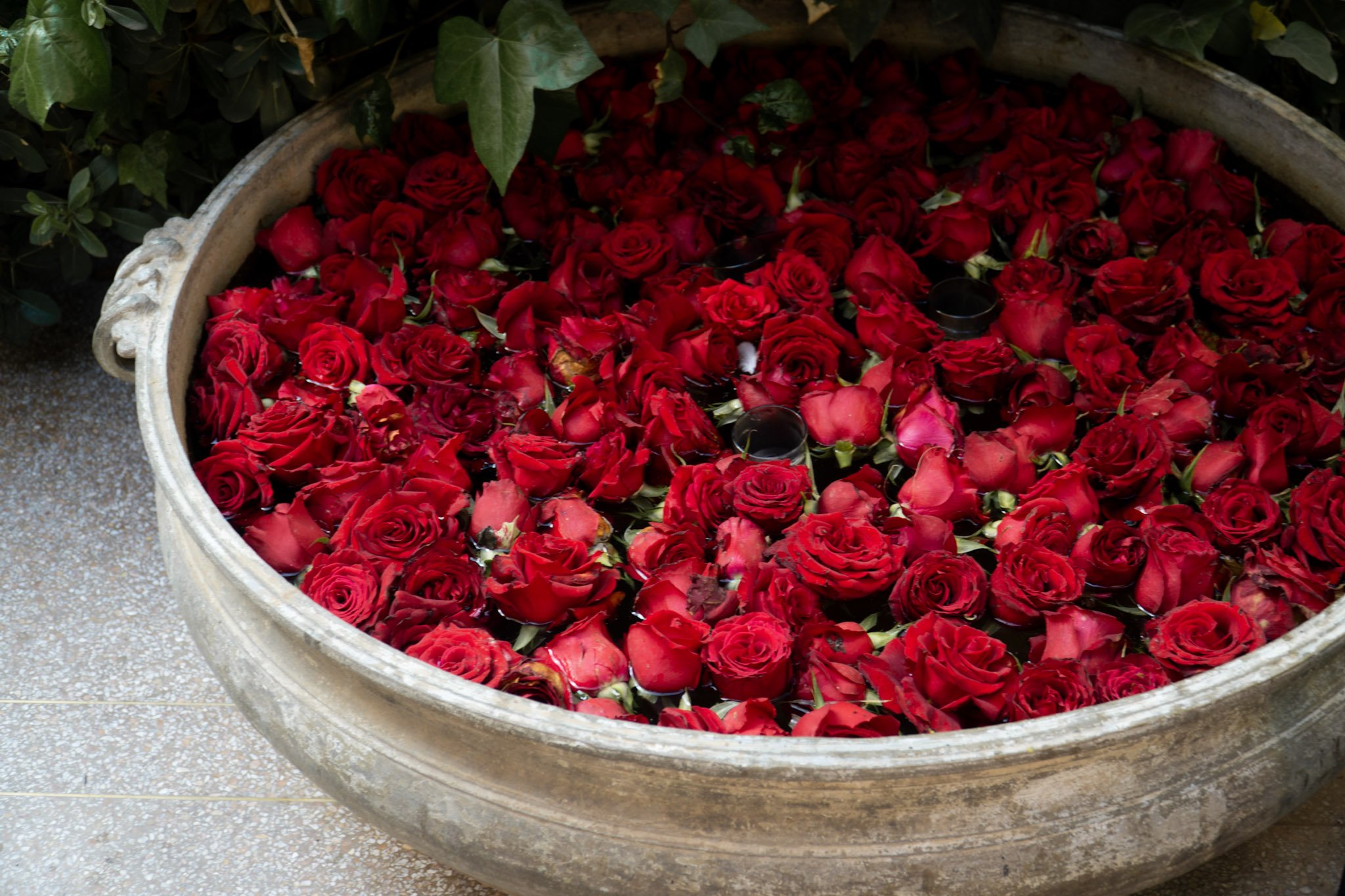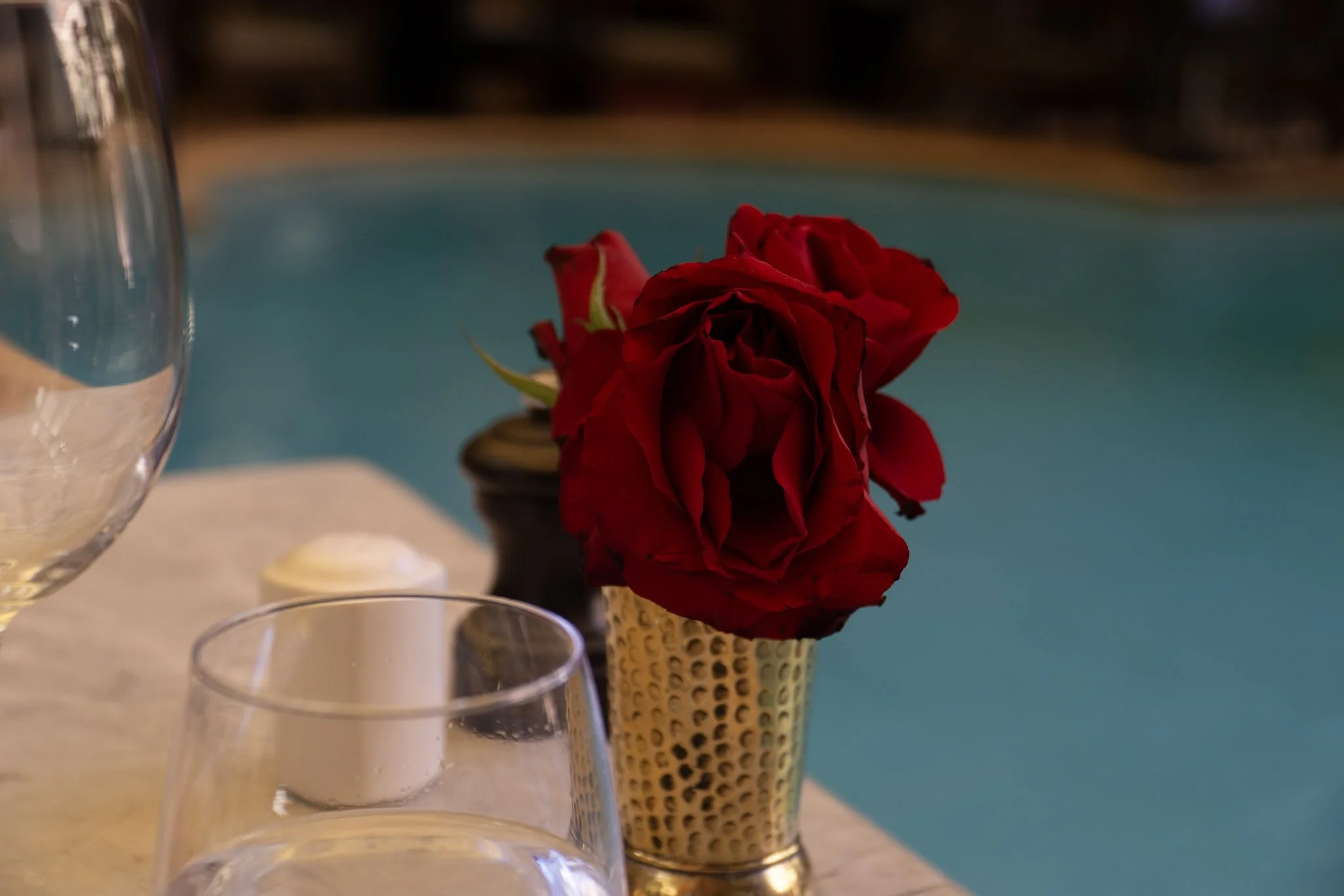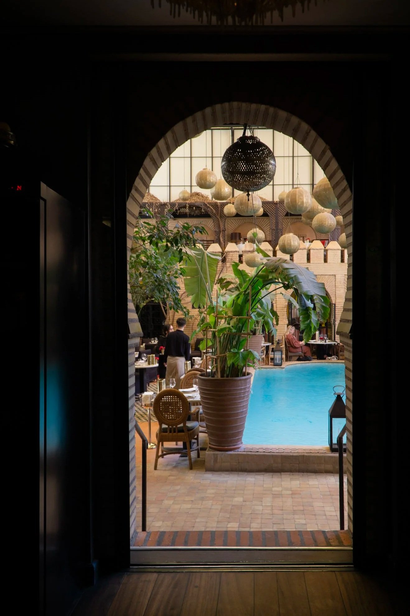 The interior is designed like many traditional Moroccan buildings and riads, with a small pool in the center of the room, tables arranged around it, fresh roses on the tables, and soft, soulful music playing in the background. It feels grand and elegant but also very calm and intimate at the same time.
