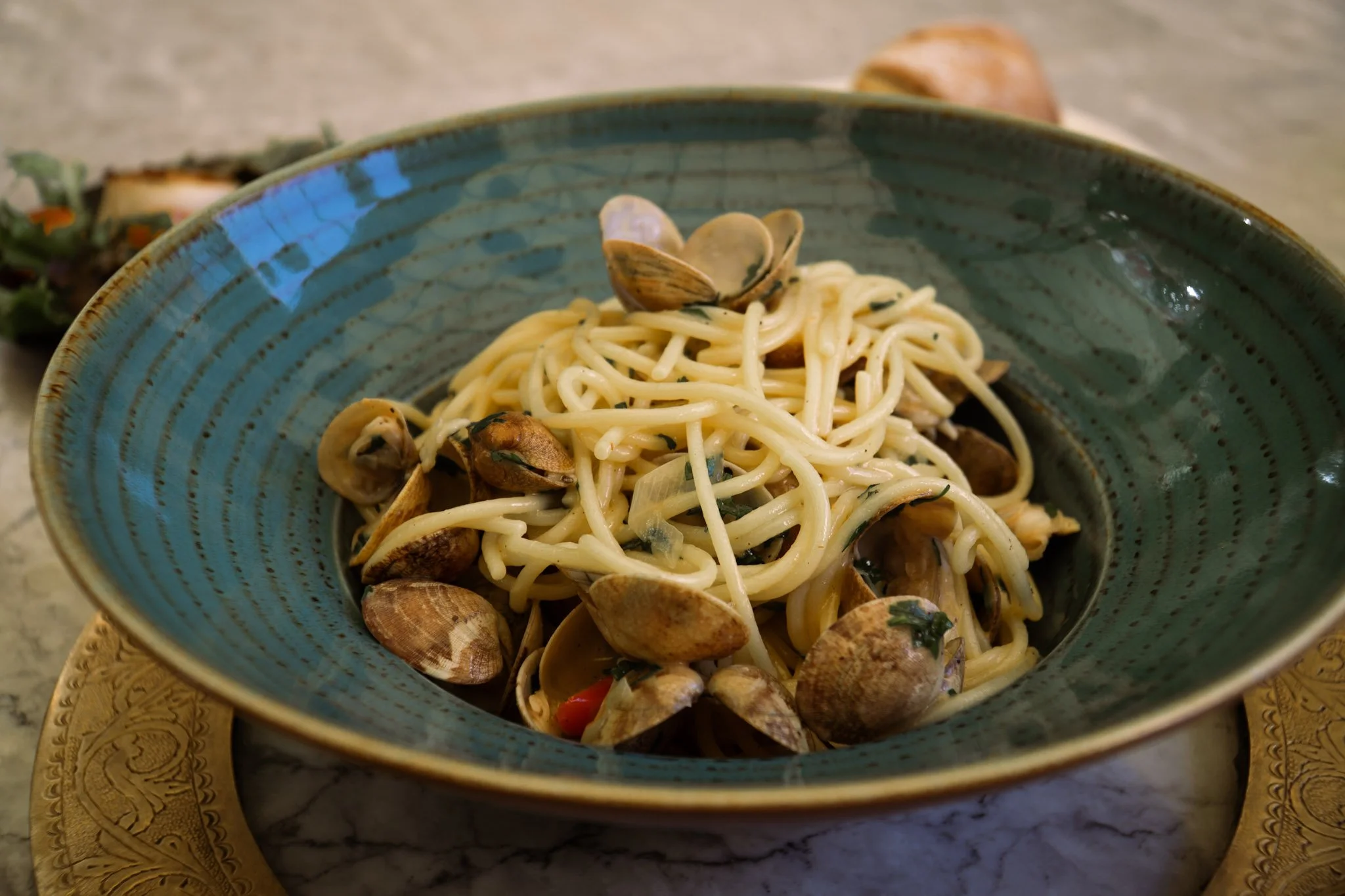 Before your meal, they bring out rolls and an eggplant salad for the table, which is a really nice touch while looking over the menu. For my meal, I ordered the Spaghetti alle Vongole and added scallops, and the portion was very large—easily big enough to share if you’re not dining alone. The food tasted fresh and light, which was exactly what I was looking for after eating heavier Moroccan dishes for several days. I would also recommend the lemonade if you want something refreshing to drink.